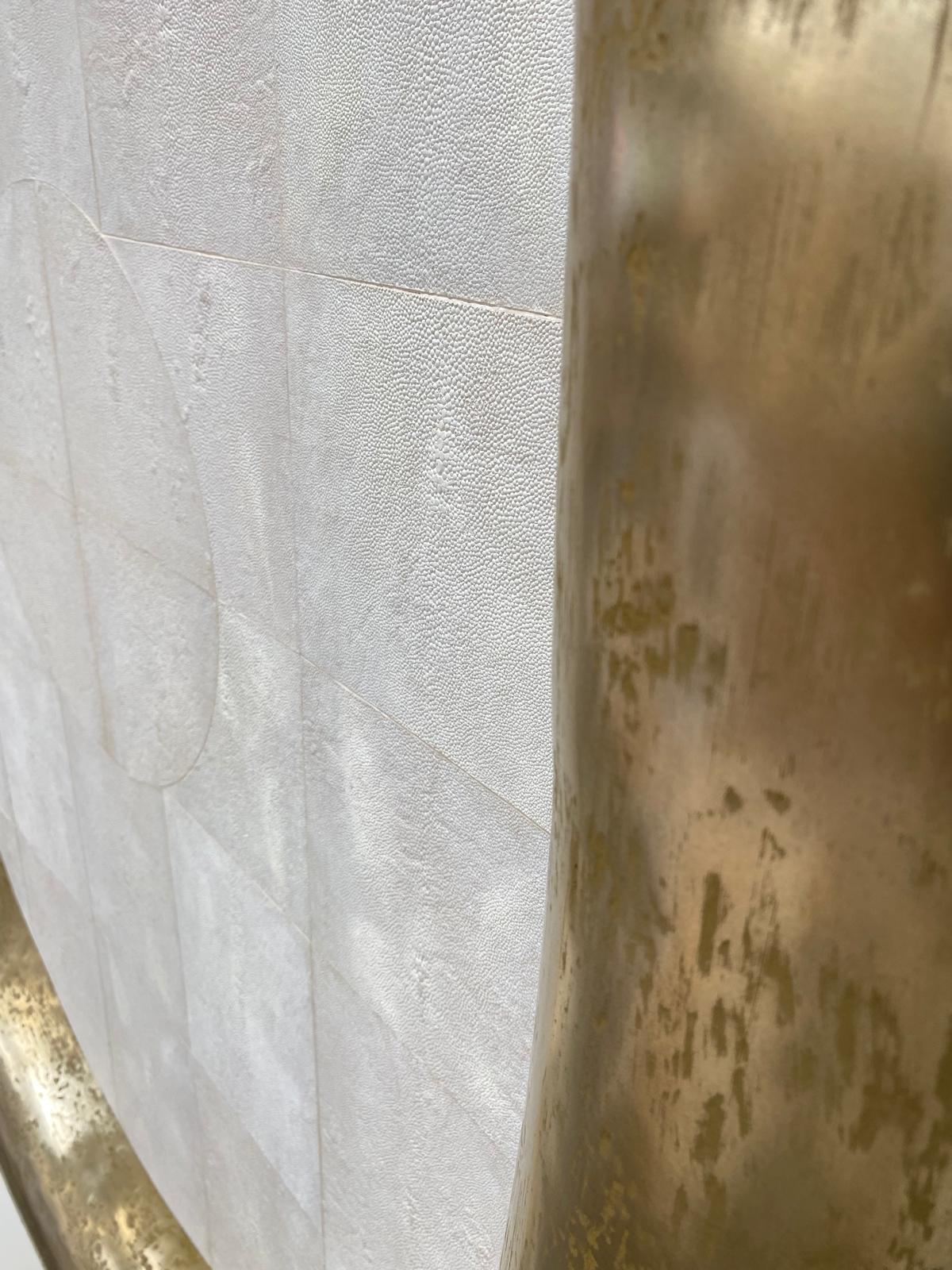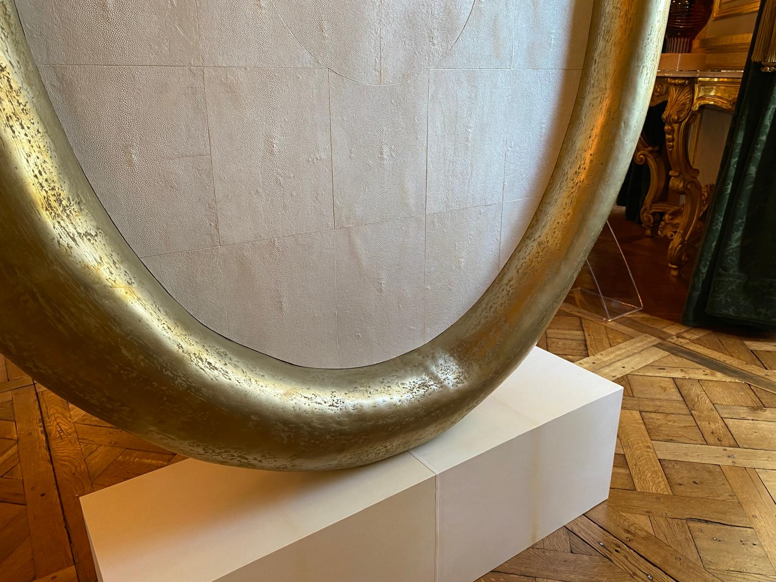 Born from a collaboration between MAISON LOUIS-MARIE VINCENT and the Paris-based designer JÉRÉMY PRADIER-JEAUNEAU, this mirror rests on a parchment base topped with a Lunepierre horn, the Maison’s signature material, treated with cold metallization and finished in brass. The reverse is clad in Lunepierre with a shagreen texture.