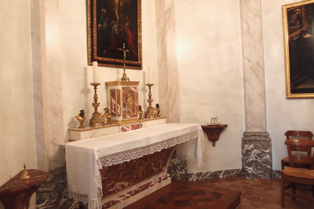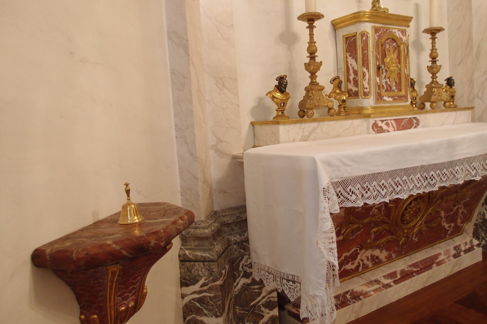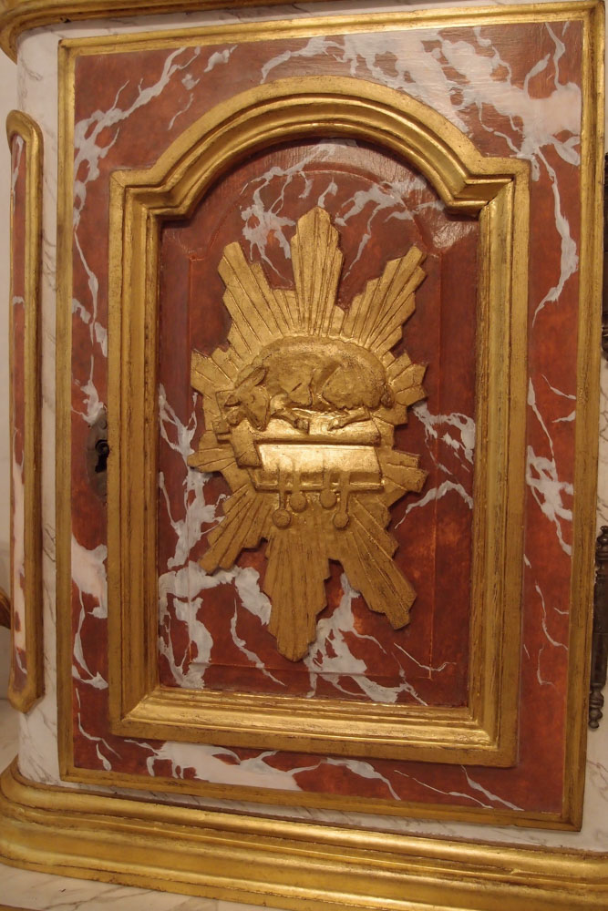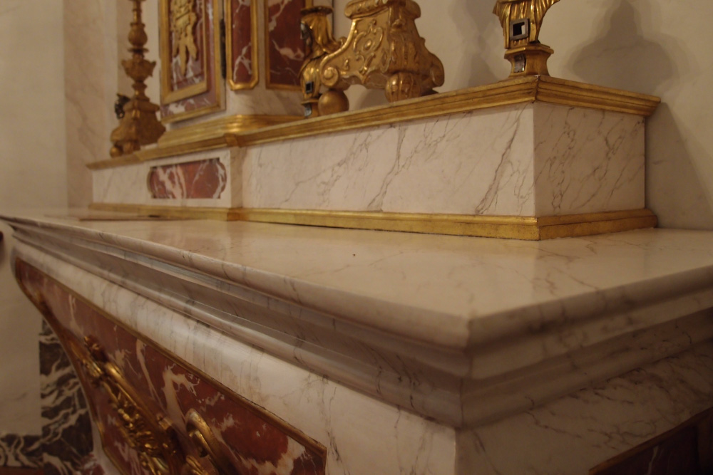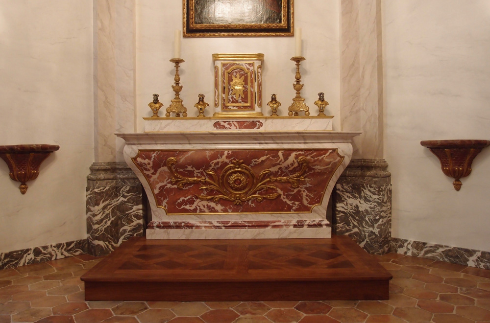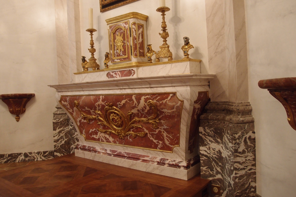 Reconstitution and decoration of a private chapel from ancient materials for a private castle in Entre-deux-Mers in Aquitaine. Gold leaf and marble in trompe l’oeil.
