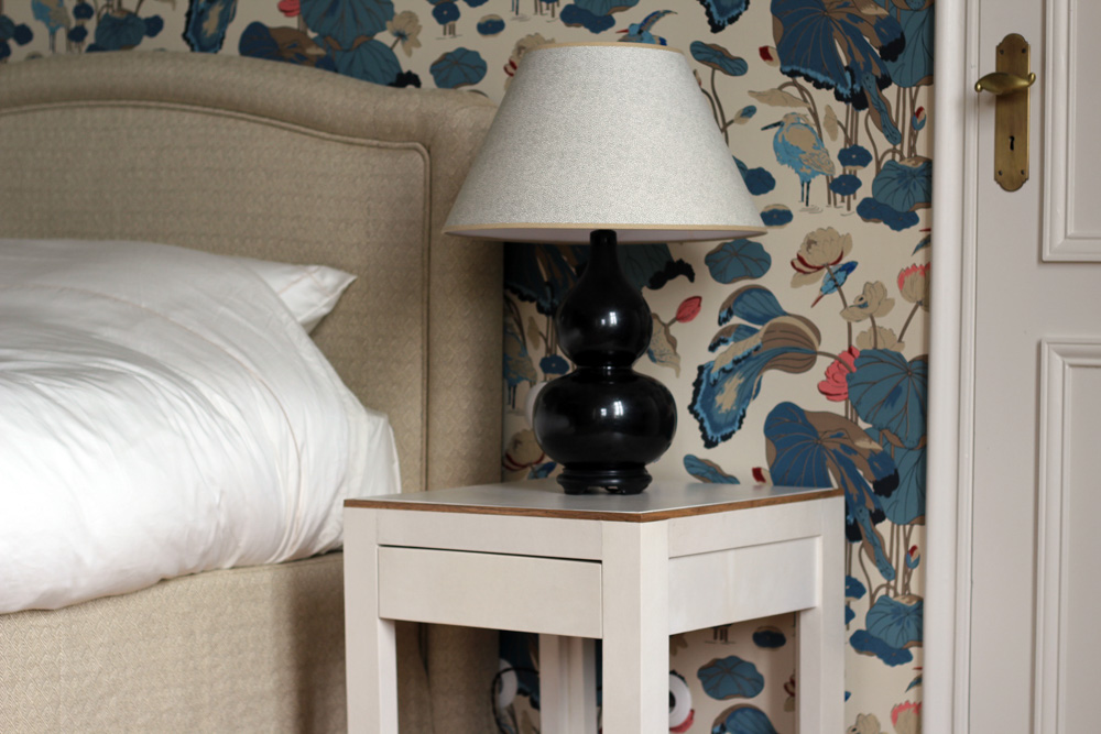 Pair of beside tables realized in natural parchment and walnut in partnership with the Belgian interior design studio La Sablière Interiors.
