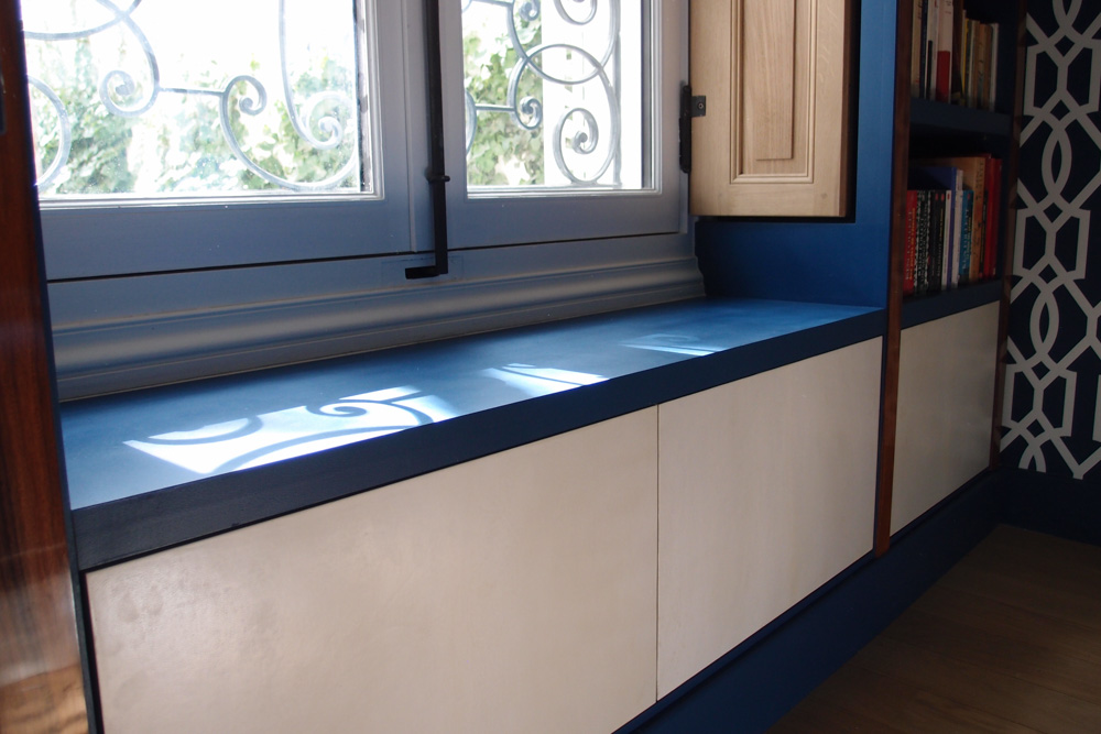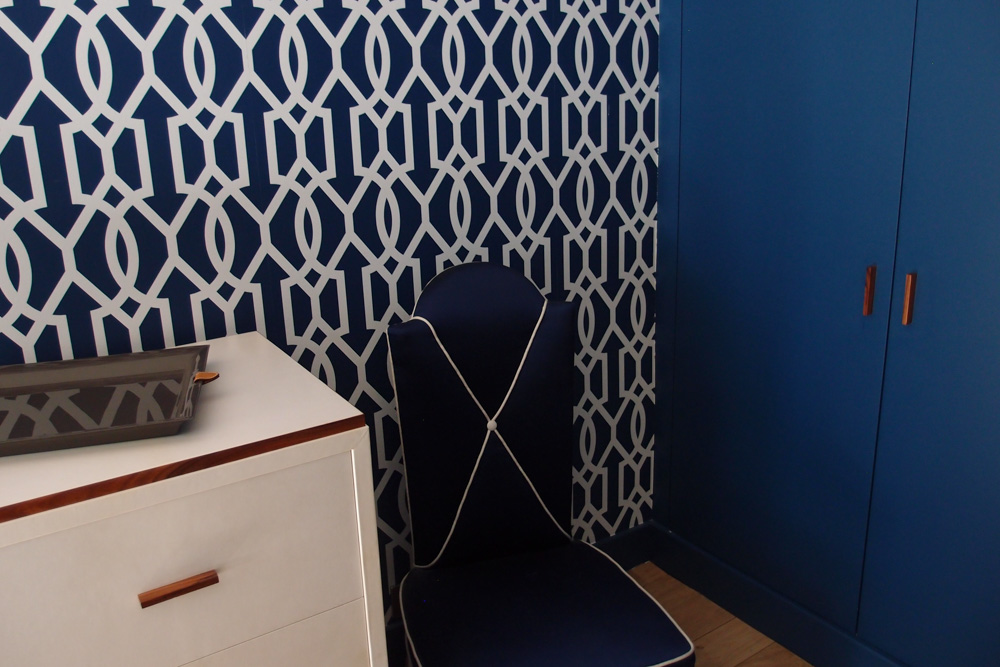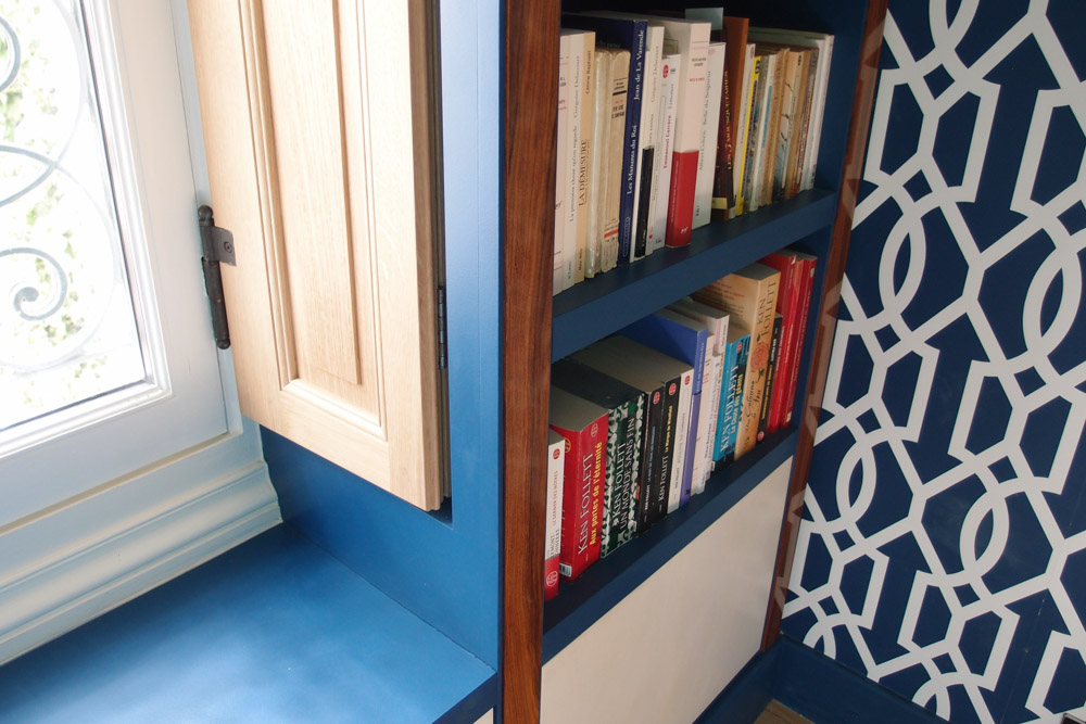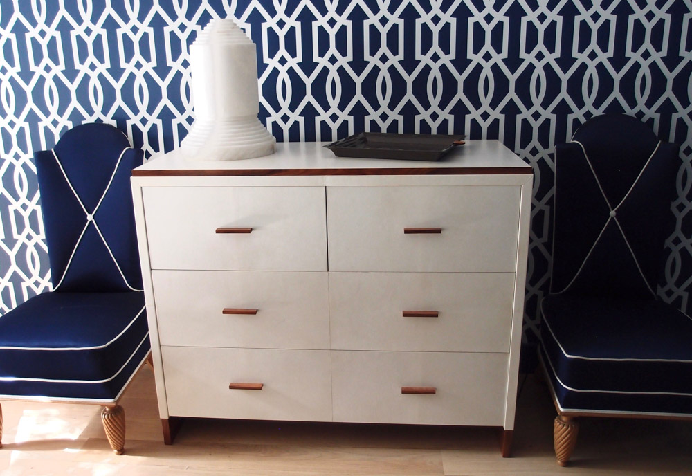 Design and creation of a set of fine furniture made of natural parchment and Brazilian rosewood for the parental bedroom : headbord, beside tables, chest of drawers and a library in the Art Deco style. Detail of the handles of the dressing in Brazilian rosewood.