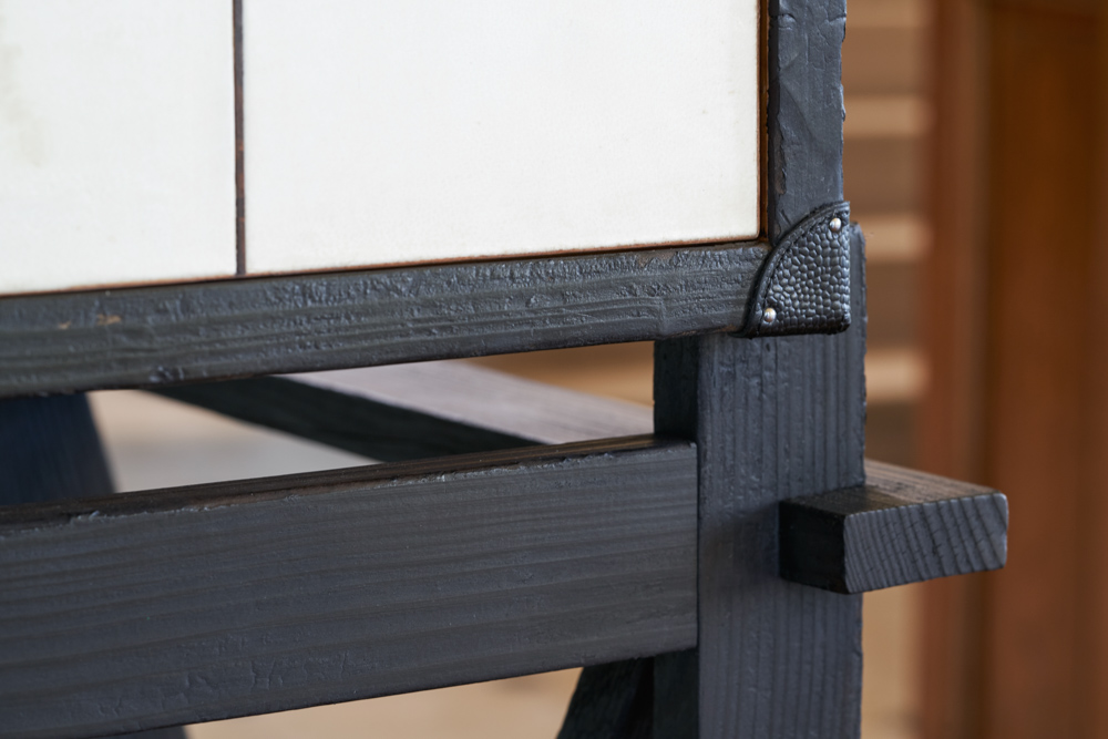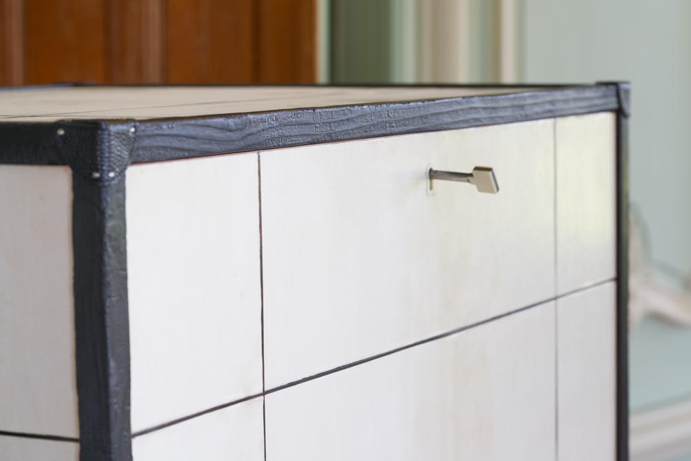This spirits cabinet is covered in natural parchment and burnished wood on the outside and tineo on the inside. The corners of the cabinet are protected by black grained leather which gives it the appearance of a trunk.