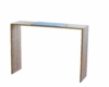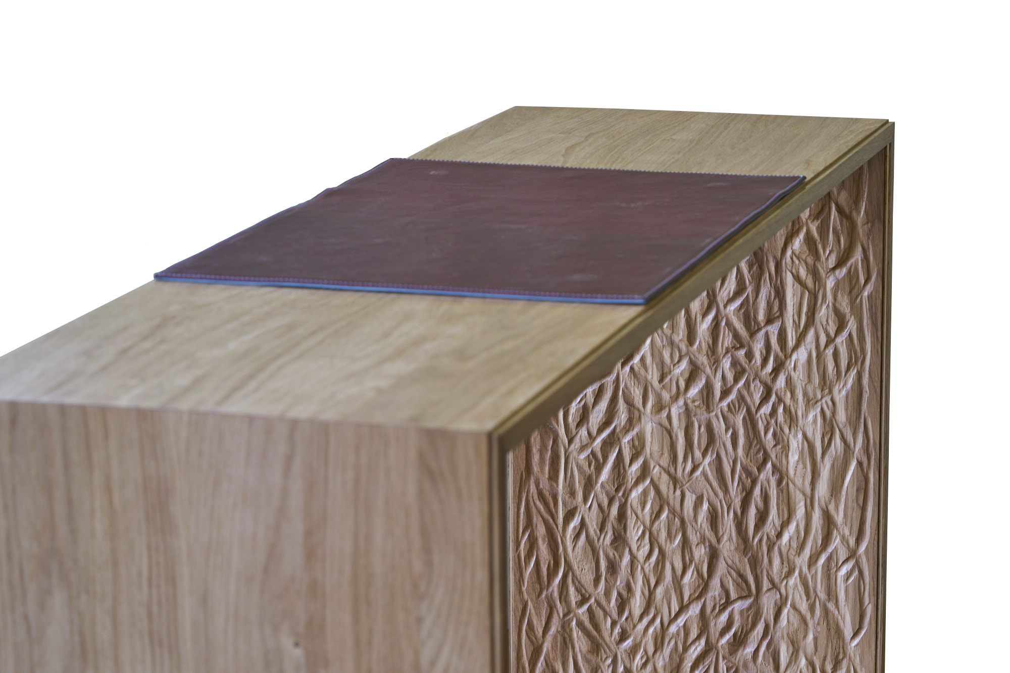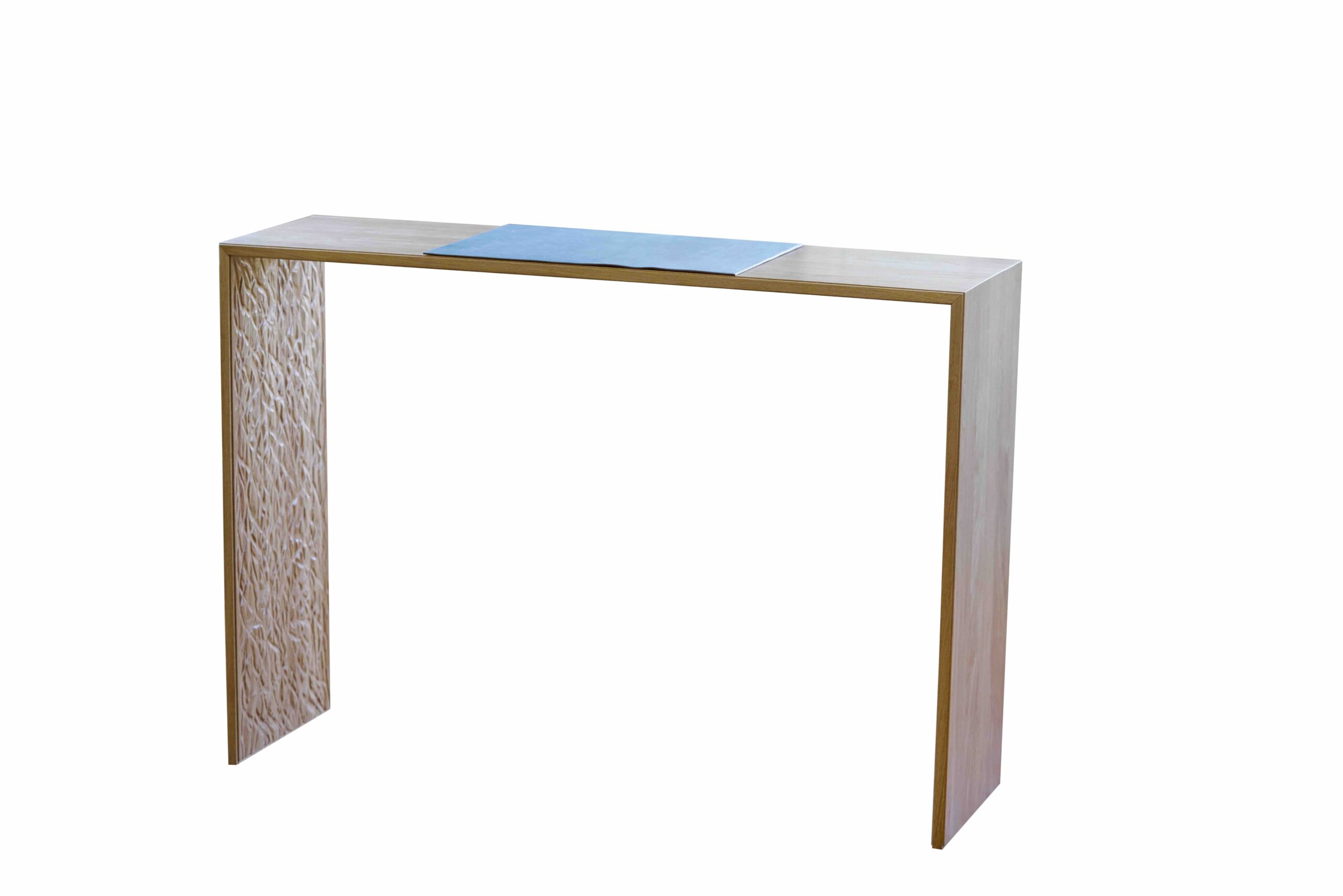 This console explores the contrast between formal precision and artisanal expression. Crafted entirely from solid oak, its inner side reveals a hand-gouged sculptural surface, echoing the natural grain of the wood. A fine brass inlay outlines the edges, while a reversible leather blotter, in burgundy and sky blue, adds a subtle, elegant accent.