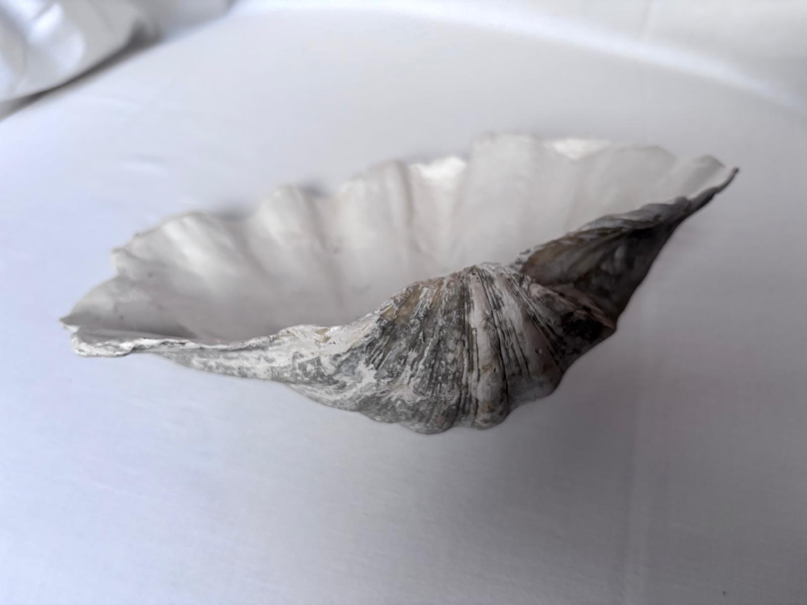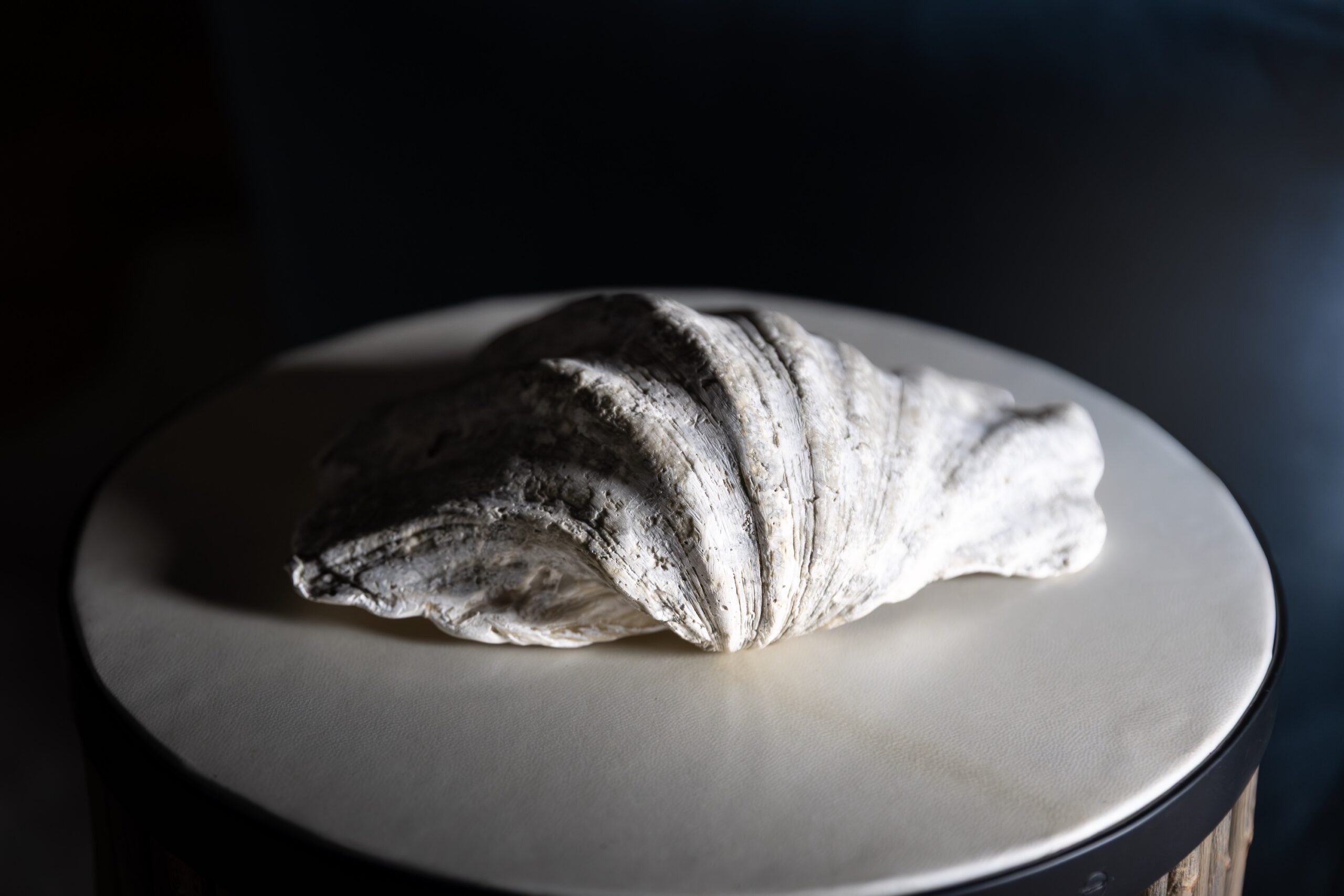 Inspirée d’un coquillage ancien, sa forme en conserve les reliefs et les irrégularités naturelles, volontairement préservés pour révéler la trace du geste et l’empreinte du temps. L’oeuvre affirme une présence organique, évoquant les formes façonnées par la nature et lentement transformées par les éléments marins.