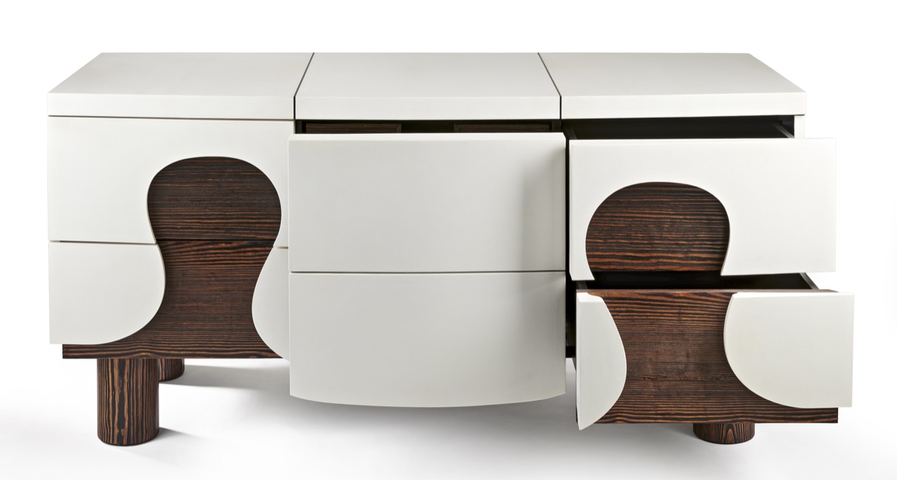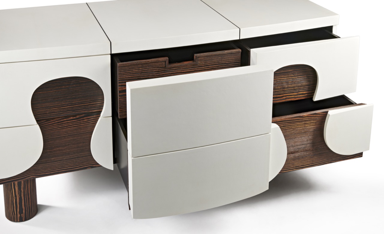 Réalisation d’une commode en parchemin naturel et pin de Caroline pour le designer parisien Hubert Le Gall.