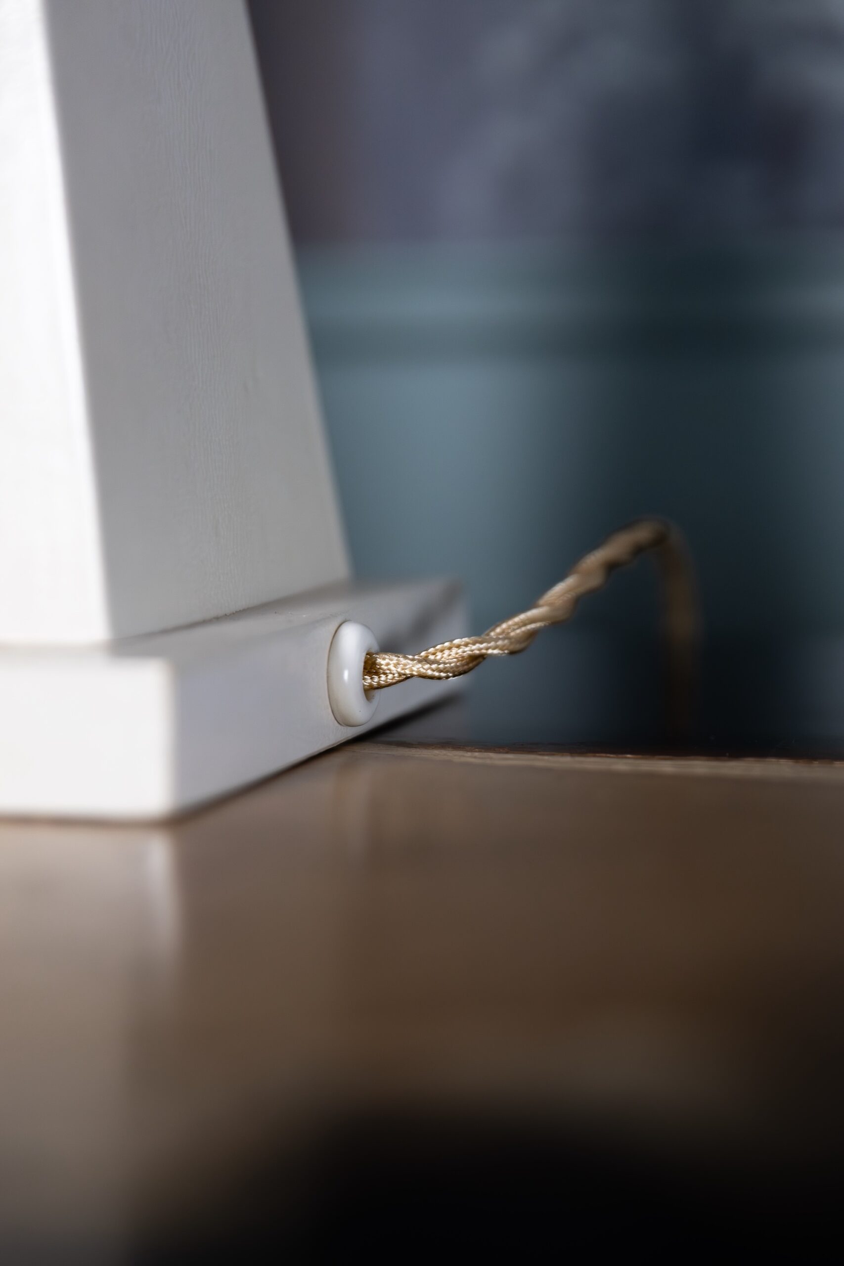 Structure en bois gainée de parchemin naturel, avec passe-câble en os.