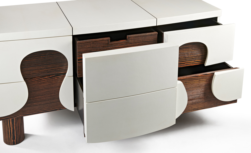 Réalisation d’une commode en parchemin naturel et pin de Caroline pour le designer parisien Hubert Le Gall.
