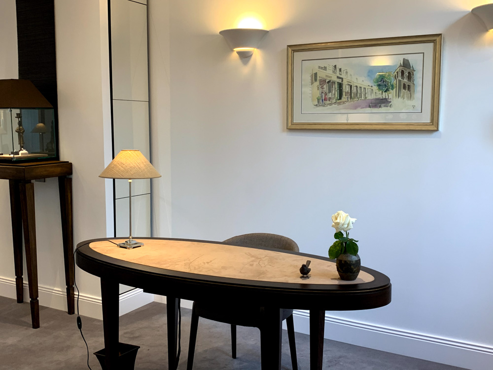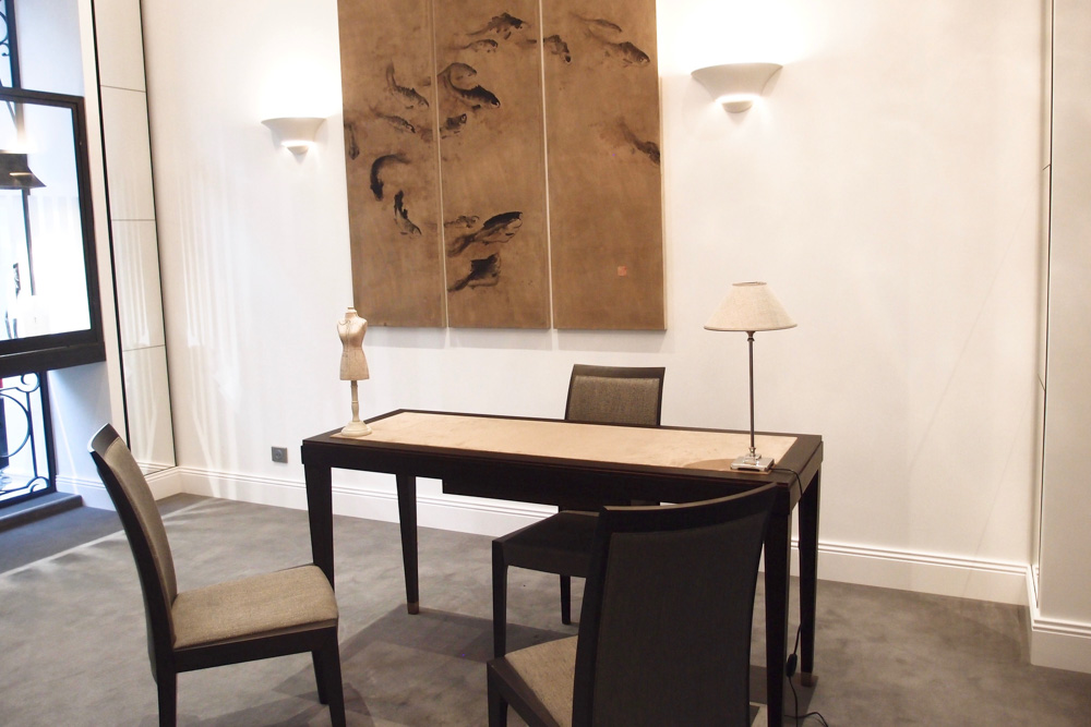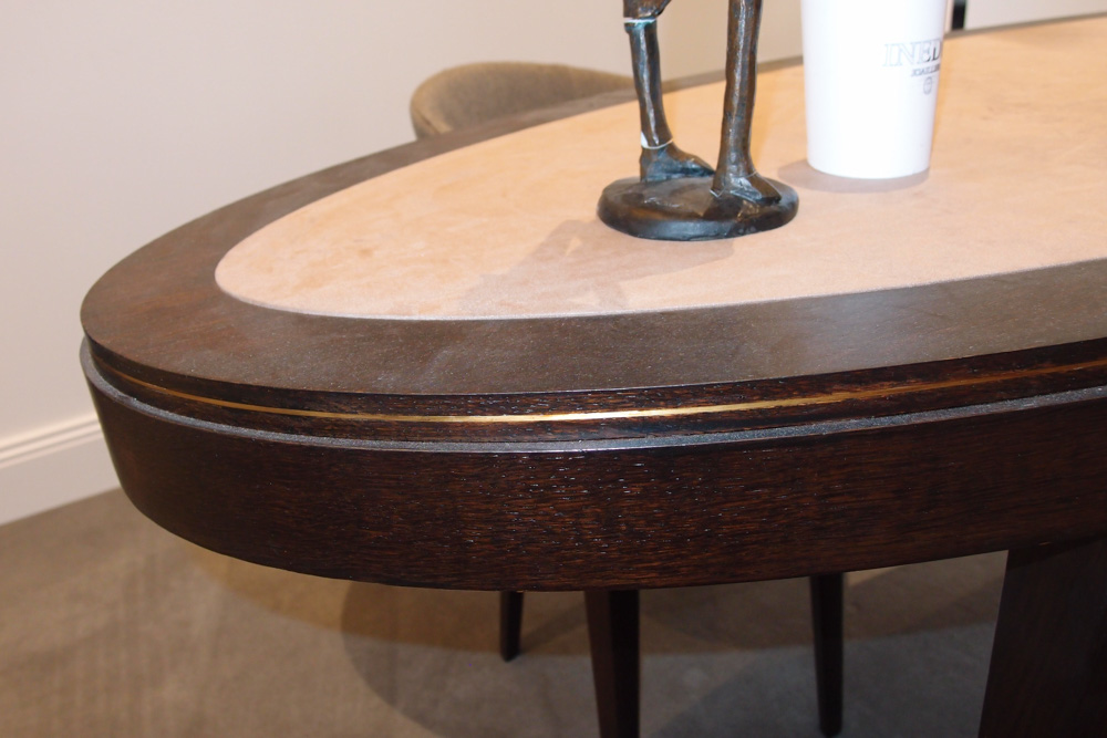 Design et fabrication de tables ovales et rectangulaires pour le nouveau showroom de la Maison de Joaillerie Inédit, rue de l’Abbaye. Réalisations en chêne, finition wengé, avec incrustation de filets en laiton. Les pieds des tables sont agrémentés de sabots en laiton.