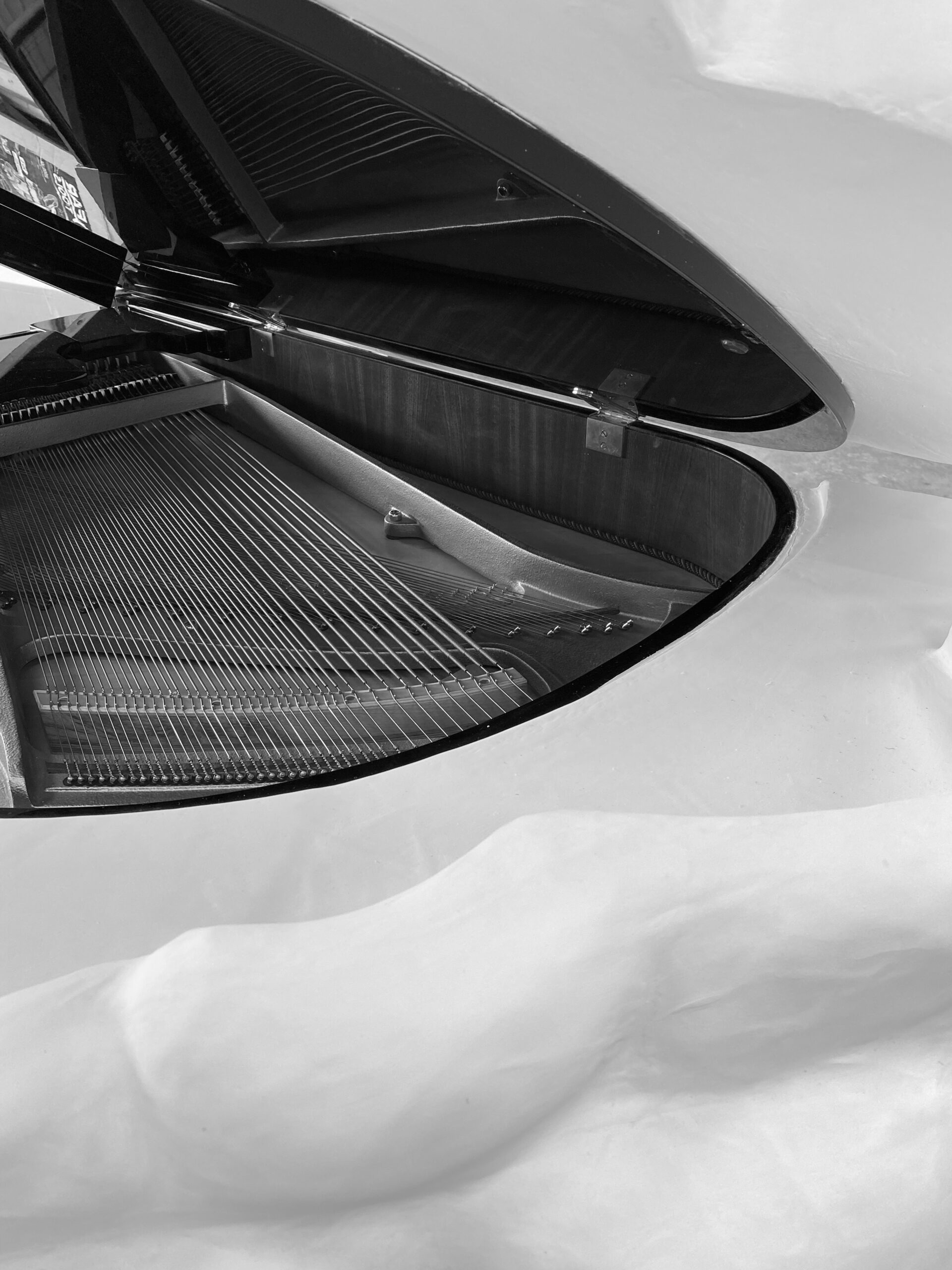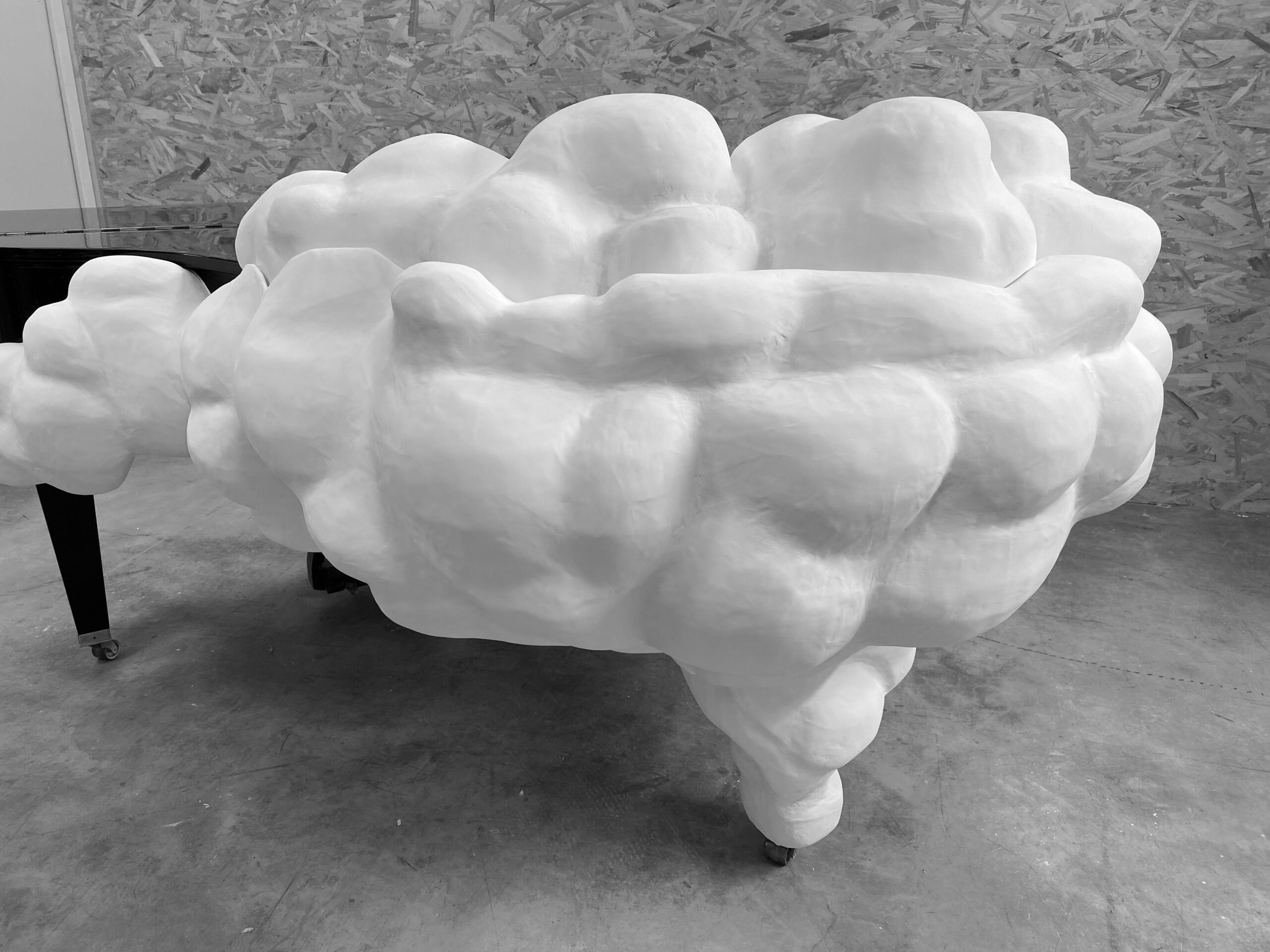 Des nuages façonnés en Lunépière viennent envelopper la ceinture et le pied arrière de l’instrument, créant un dialogue organique avec la rigueur de sa ligne. L’intervention a été pensée dans le respect absolu de l’ouverture du couvercle, de la mécanique et de l’intégrité fonctionnelle du piano, affirmant une approche où la sculpture accompagne l’objet sans jamais en altérer la vocation.